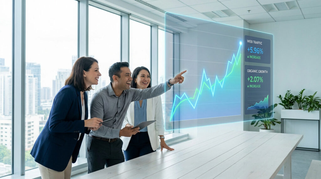 Équipe SEO souriante examinant un graphique holographique de trafic web (+5,96%) et croissance organique (+2,07%) en bureau moderne.