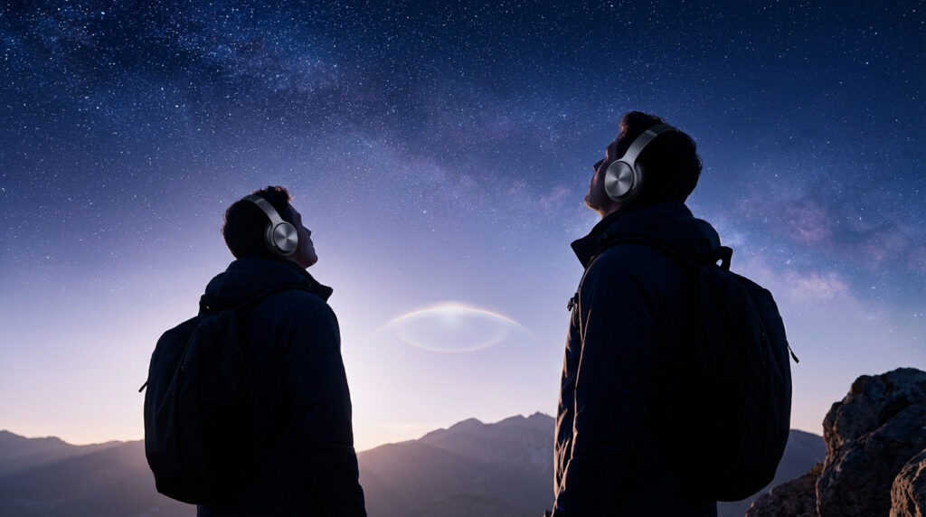 Deux personnes en silhouette, casques audio, regardent le ciel étoilé. La Voie lactée, montagnes et un halo lumineux sont visibles.